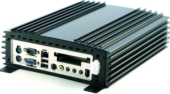 I ended up getting a barebones Wind PC with an atom 330 Dual core processor. It comes with an AC adapter, but has an external connection which takes 18v input (It may run on 12v input too). VGA output, 4x USB ports, Ethernet, 7.1 channel digital audi output (for surround sound), 4-in1 card reader, and an internal slot for wi-fi (antenna included).